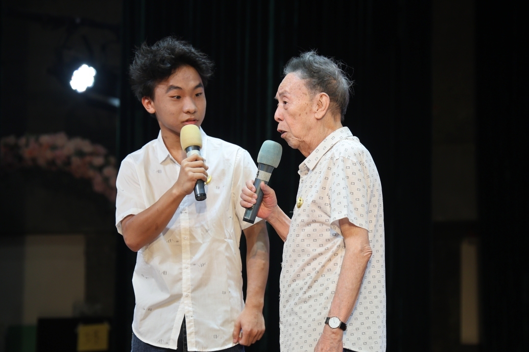 启动仪式上,粤语相声泰斗黄俊英亲授亲笔题字牌匾“越秀壹号相声学堂”,并以一场别开生面的“大师讲堂”为学员们献上珍贵的“开班第一课”,深情回顾数十年从艺心路,以鲜活的舞台故事和人生感悟,生动诠释了坚守与热爱的力量。黄俊英结合经典作品实例,深入浅出地剖析粤语相声独特的“盏鬼”神韵——如何巧妙运用粤语俚语的诙谐精妙、铺排结构的节奏张力、洞察世情的市井智慧,在捧腹大笑间传递生活哲理与文化底蕴。他寄语小学员们,学习粤语相声不仅是掌握一门技艺,更要理解其承载的广府文化基因与家国情怀。鼓励孩子们在学习中“勤练嘴皮子,更要动脑子、用心悟”,做广府优秀文化的热爱者、传承者与创新者,让岭南笑语焕发新时代光彩。讲堂尾声,黄俊英与徒弟潘泓博献上经典粤语相声《说一不二》。