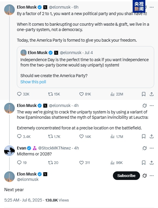 在这条宣布成立的帖文下,有网友问他的新政党是否会参加2026年中期选举或2028年的总统选举时,马斯克回复称,“明年”。