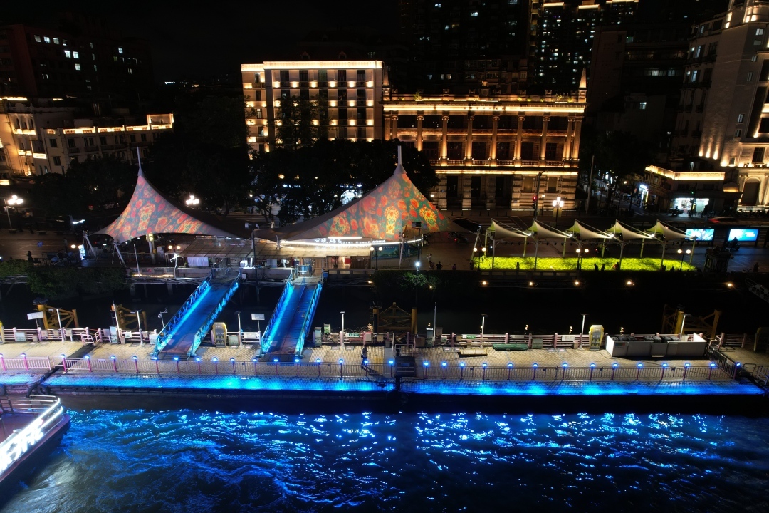 雨篷拉膜上,可循环播放的投影图案十分吸睛。夜幕降临,广州的西关特色窗花不断交替呈现,光影流转间,诉说着这座城市的千年故事。码头两边走桥的洗墙灯,用柔和光线勾勒桥身线条,让游客登船时仿若漫步星河;水排新增的灯带与路灯相互呼应,将码头水域装点得璀璨夺目。