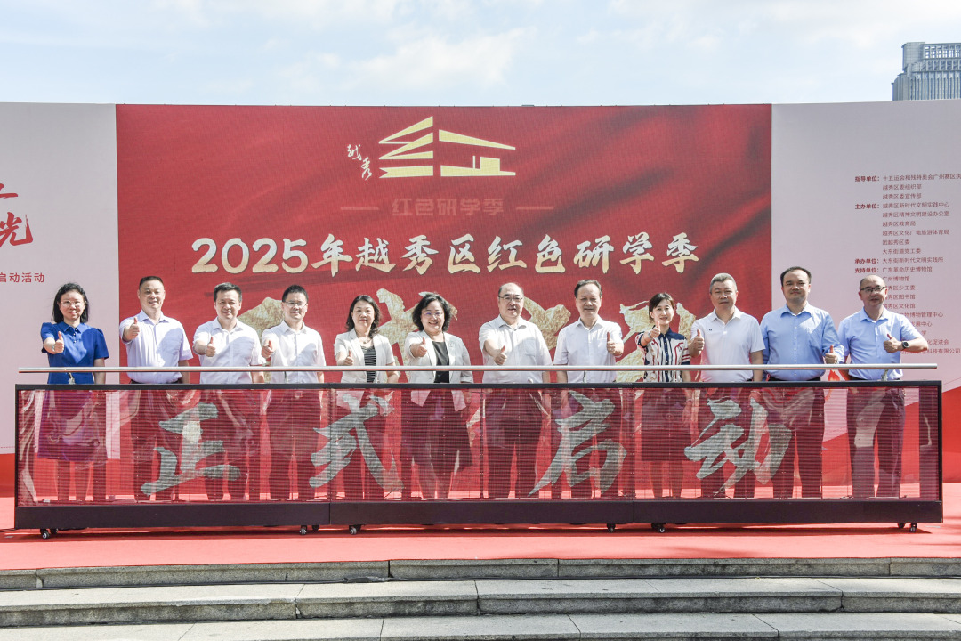 在精彩纷呈的演出中,2025年越秀区红色研学季启动倒数的声音响彻广场,“5、4、3、2、1”,越秀区红色研学季正式拉开帷幕。据悉,今年红色研学季活动将更加聚焦市民游客的体验感和获得感,重点推出“越寻足迹红”“越游文旅红”“越讲思政红”“越说身边红”“越赏展映红”“越唱时代红”“越读书香红”“越动舞台红”“越创精品红”“越行实践红”等10大特色活动板块,通过丰富多元的红色文化体验,引导党员干部群众学习红色历史、感悟红色精神。