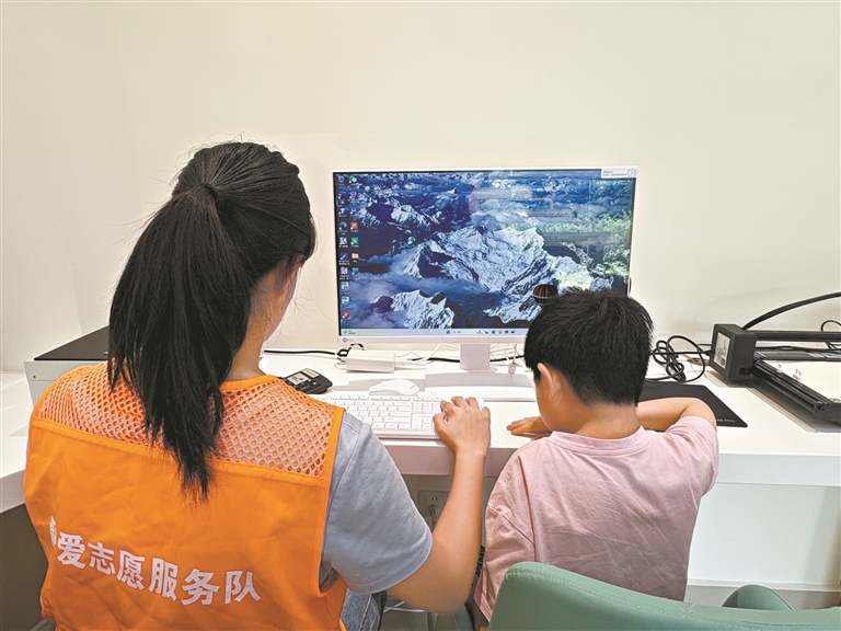 敏妮(右)在和光阅读馆学打字。