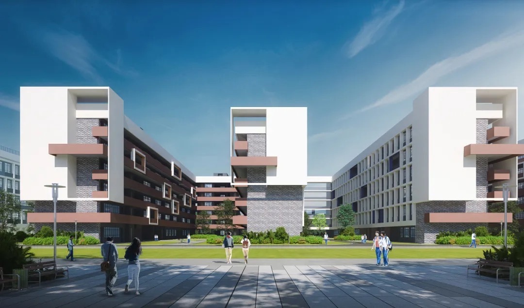 空间布局上,建筑体型比例协调,空间关系合理,从教学楼至宿舍楼形成由北向南渐次升起的优美天际线。整体建筑线条流畅大气,色调明快,充满时代感与文化底蕴。