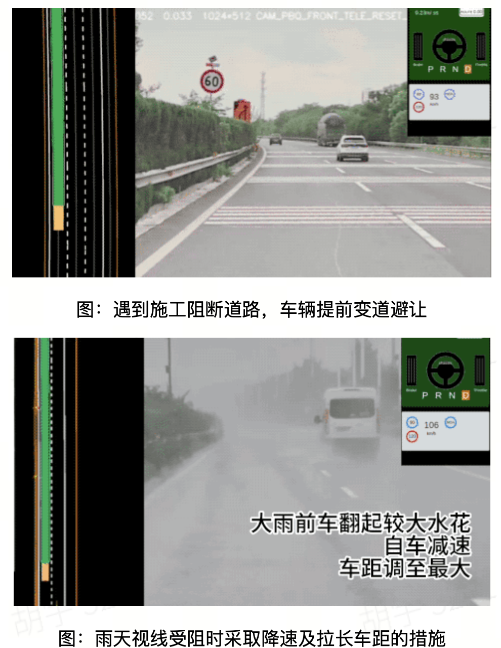 一是将已量产验证的“时空联合规划”经验融入One Model端到端模型,并借鉴大模型安全对齐思路,让模型规划轨迹严格符合人为定义的安全机制;同时通过世界模型批量生产罕见场景,进一步强化模型对安全临界场景的应对能力。如轻舟智航通过加强对特殊场景的积累与识别,优化主动安全策略以规避风险,例如面对大雨、大雪、大雾等恶劣天气,系统将主动降低巡航车速,并拉大跟车距离,提升行车安全性;面对施工路段,当发现自车驶入施工车道时,系统会结合地图导航和实时感知综合判断,提前 300 - 500 米规划变道,远离施工区域;若识别到前方多条车道施工且无变道空间时,系统会在 300 米外将巡航车速降至 100kph,确保车辆能平稳刹停,有效规避碰撞风险。