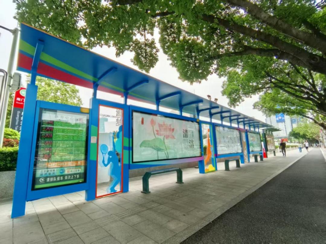 广州市交通运输部门充分利用“车、站、亭、路、服务区”等交通场景打造“五位一体”场景化宣传矩阵,广泛刊播全运会宣传海报、宣传标语口号,强化十五运社会氛围营造。