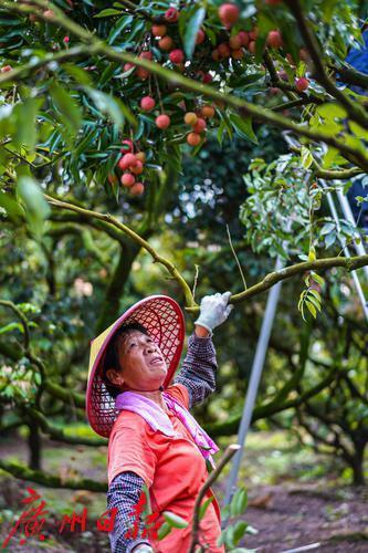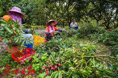 在稻田旁的农庄,还有荔枝种植园供游人体验采摘乐趣。夏日正是荔枝成熟时,园内荔枝挂满枝头,颗颗饱满诱人。农户们正在采摘荔枝,树下还养着“走地鸡”,鸡以掉落在地的荔枝为食,这使得它们的肉质佳、味甘甜,著名的“朱村鸡饭”便以这些奔走在荔枝树下的鸡肉为原材料煲煮而成,吸引不少食客前来品尝。
