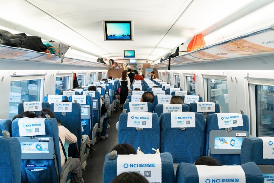 新华保险冠名品牌专列围绕“保得长久”核心价值主张,打造了丰富的视觉传播场景。列车车身贴有“新华保险 保得长久”品牌口号,车厢内设有主题海报、座椅头片、桌板广告、天幕灯箱、LED屏等多点位传播阵地,系统展示新华保险在以分红险为代表的多元产品体系、品牌实力、客户服务等领域的核心优势。