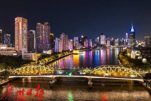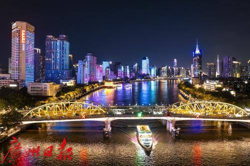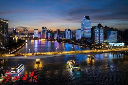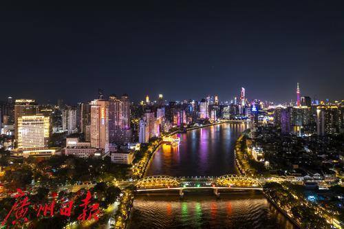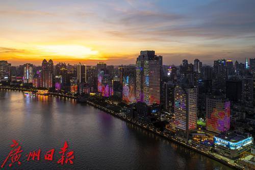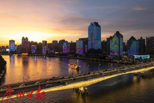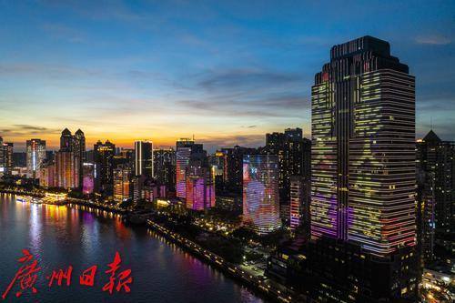 7月8日晚,海珠桥到江湾桥北岸24栋建筑亮起第十五届全国运动会主题灯光动画,成为珠江夜景中璀璨的风景线。主题灯光动画中有“第十五届全国运动会2025年11月9日广州开幕”、“追梦大湾区,出彩人生路”、“激情全运会,活力大湾区,美丽新广州”等字样,还有十五运会会徽和十五运会吉祥物“喜洋洋”和“乐融融”等图案出现。