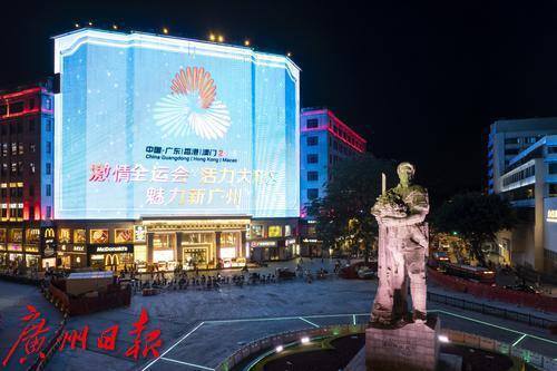 海珠广场大屏幕出现“激情全运会,活力大湾区,美丽新广州”字样和十五运会会徽。