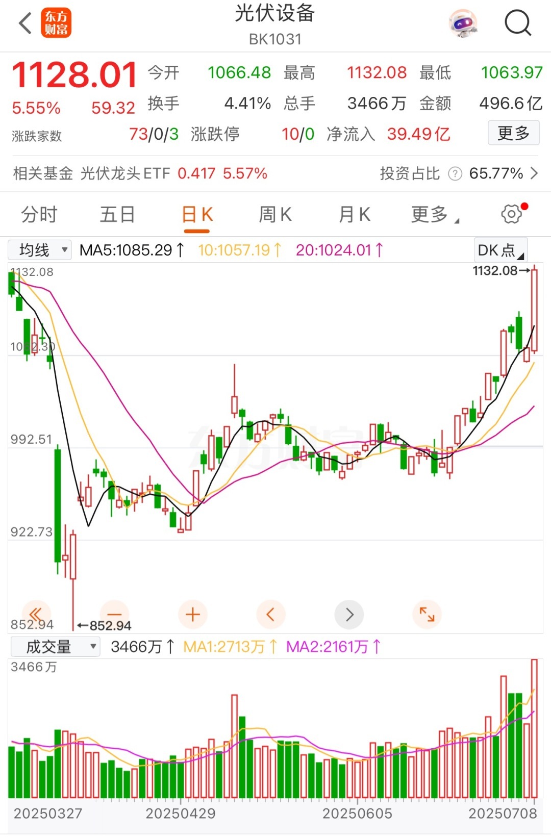 “反内卷”概念板块大涨。其中,光伏产业链集体爆发。截至收盘,多只个股涨停,亚玛顿上演“地天板”。光伏龙头ETF涨超5%,多晶硅主力合约触及涨停。