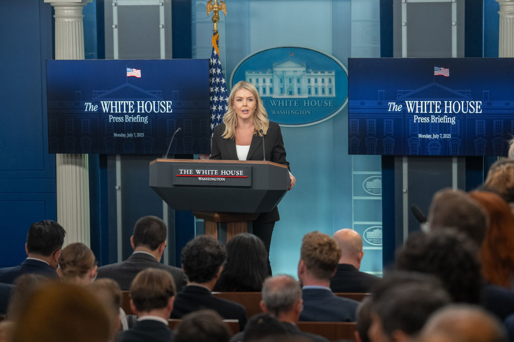 7月7日,在美国首都华盛顿白宫,白宫新闻发言人卡罗琳·莱维特出席记者会。新华社记者胡友松摄