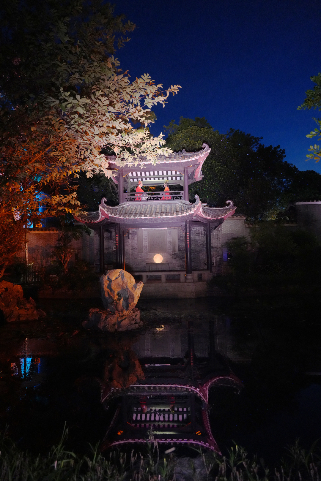 作为大湾区首个园林主题夜游项目,梁园夜游以“岭南夏韵”为主题,融合园林演艺、光影艺术、非遗体验与岭南茶席。