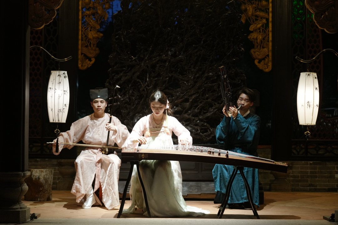 从岭南民乐演奏,到舞蹈表演,再到粤曲演绎,将岭南戏曲的千年音韵娓娓道来;每个场景都为游客带来了不同的文化体验,仿佛穿越时空,领略到古人的雅致生活。