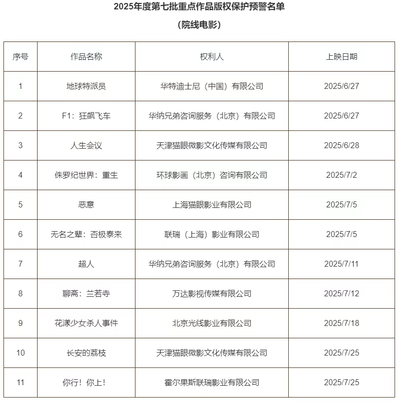 国家版权局近日发布2025年度第七批重点作品版权保护预警名单(院线电影)。《地球特派员》《人生会议》《超人》等院线电影上榜。