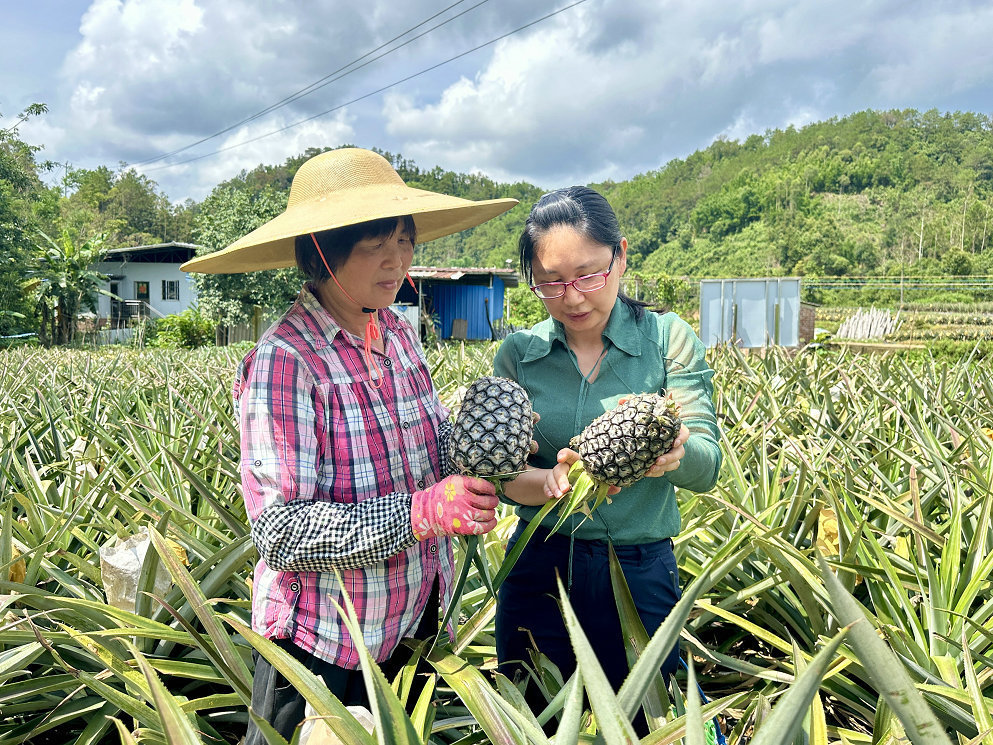 吴秀兰(右)在双马菠萝种植基地了解情况