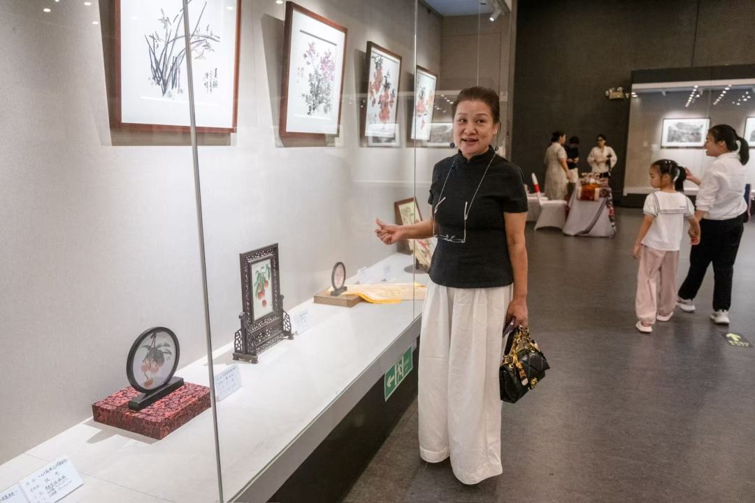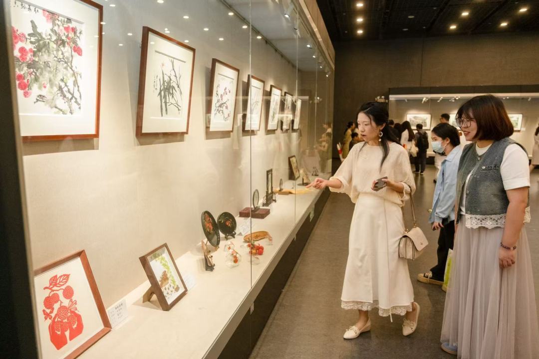 现场不仅有国画、书法作品,剪纸荔枝、广绣荔枝、掐丝珐琅荔枝、衍纸荔枝……多种形式荔枝主题艺术品让观众们大开眼界。记者看到,在两幅荔枝广绣作品前,不少观众一眼就认出“这个是糯米糍,这个是桂味”。