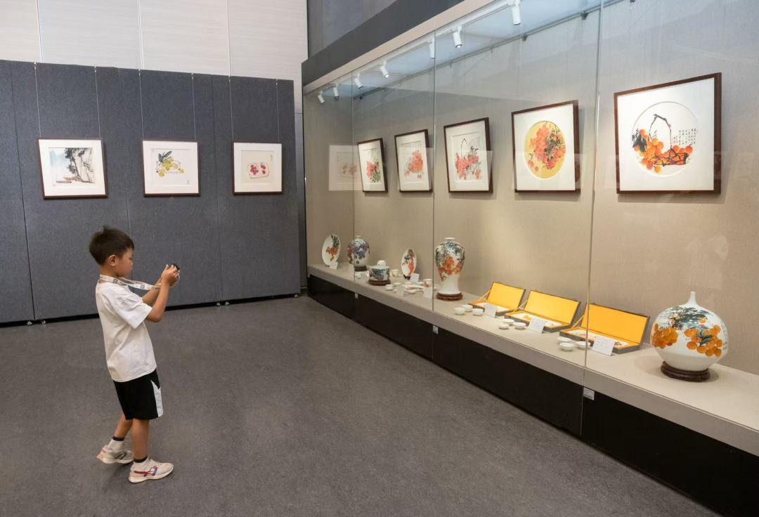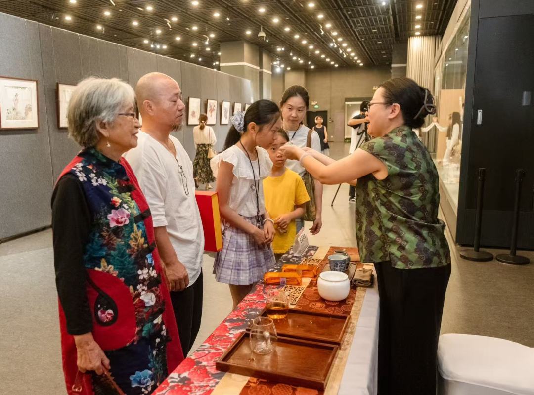 除了精彩的书画作品,大源街“源志愿”服务队还精心策划了多项志愿活动。书画艺术交流活动面向全社会开放,为书画爱好者搭建学习交流平台;荔枝茶席品鉴邀请华南农业大学茶学系专家,将荔枝文化与茶文化巧妙融合,带来沉浸式体验;荔枝文创展示区陈列着荔枝主题山水画周边文创产品,如非遗广绣、广彩瓷器等,展现岭南文化的深厚底蕴与创新活力。