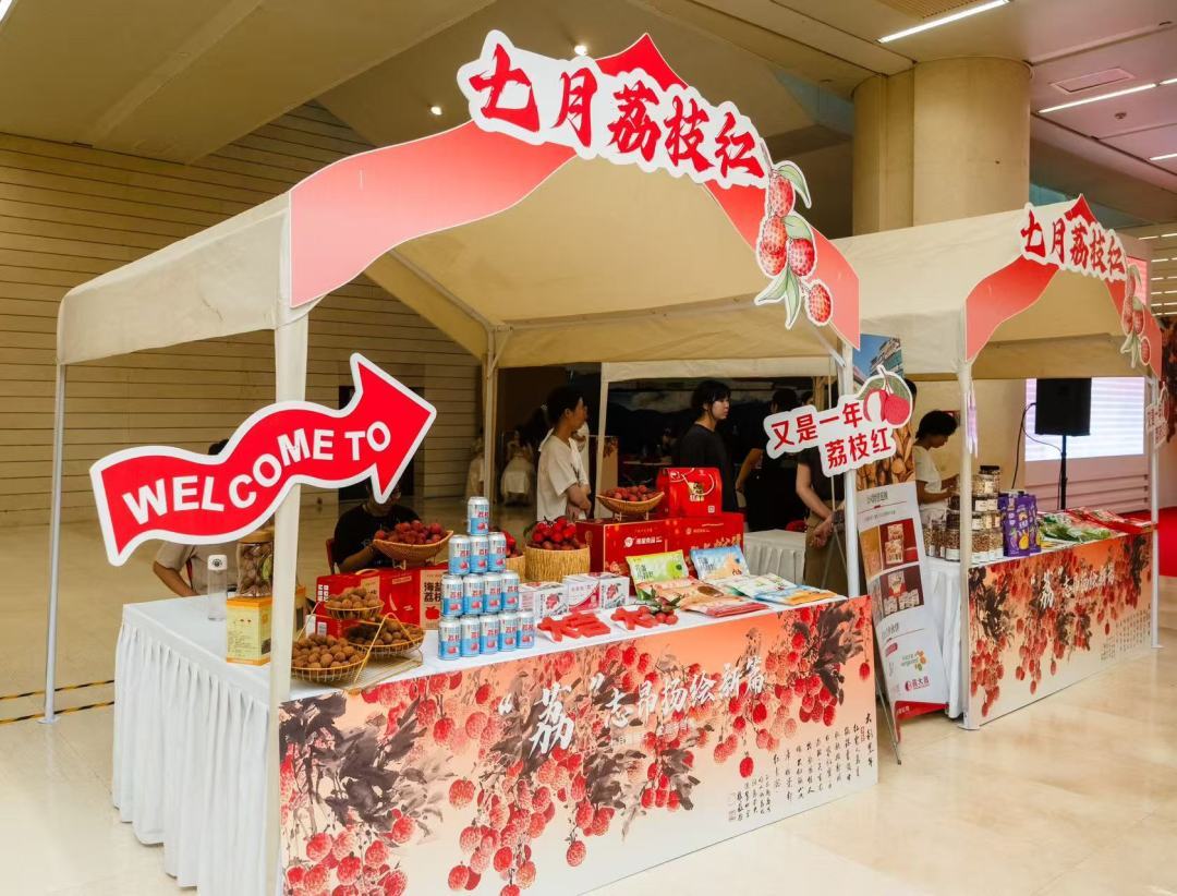 活动现场,白云区农业农村局设立荔枝助农推介专区集中展示白云区农户种植的新鲜荔枝、荔枝干、荔枝马蹄糕、荔枝发酵饮品等特色农产品和深加工产品。