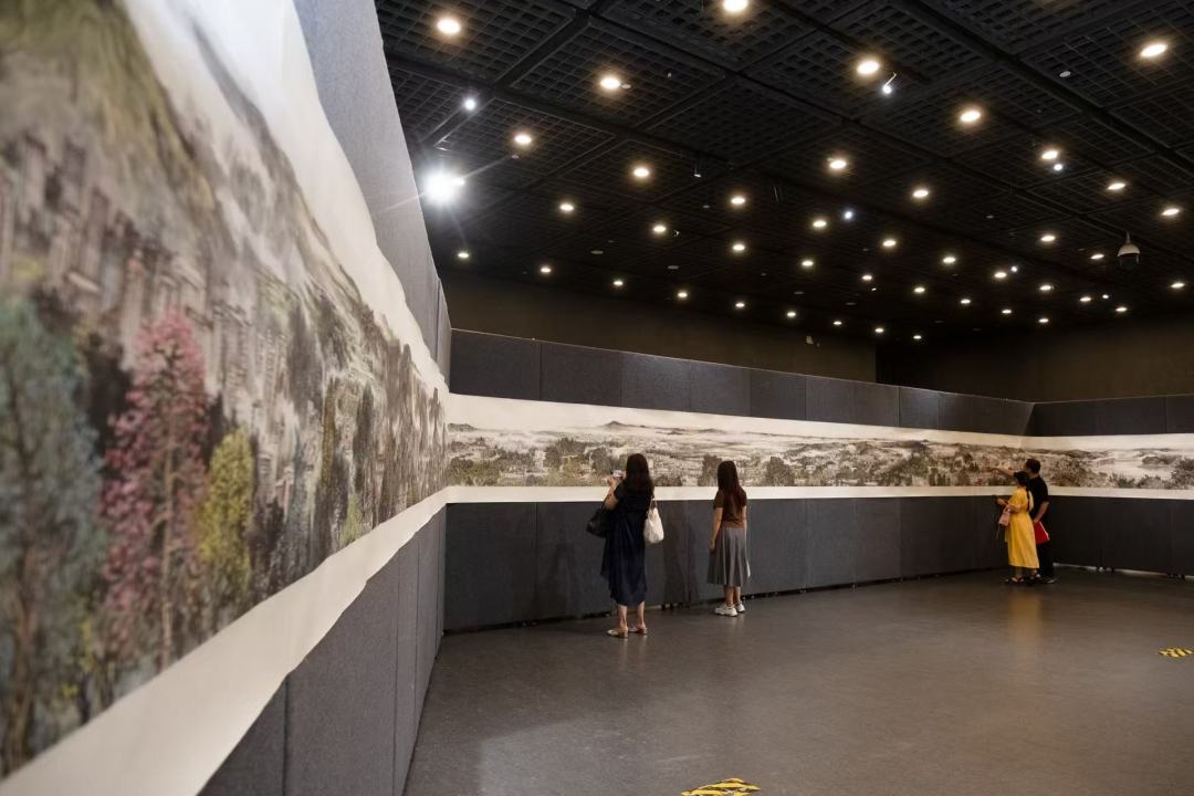 核心展区是一幅30米巨幅山水画长卷《大源蝶变图》。该画卷主体部分长30米,宽1米,大源村党群文化广场,大源水库、大源龙口公园、垃圾分类科普馆、德才范公祠、碧道、六片山、百年香樟树等标志性场景跃然纸上,飘逸缭绕的云雾、形态各异的人物,往来车辆等,极富动感和气韵。