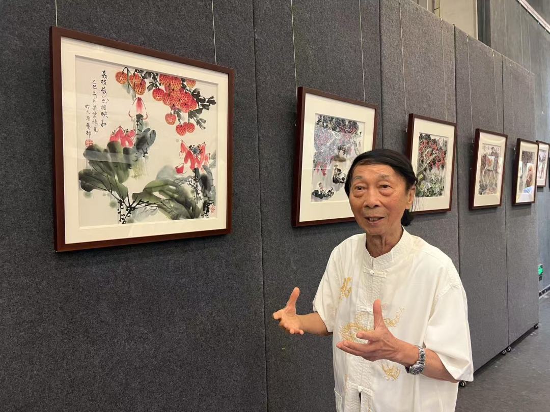 “很高兴我的小品登上大雅之堂。”展览现场,中国美术家协会会员、“岭南荷痴”梁业鸿饶有兴致地为大家介绍道,“著名雕塑家唐大禧在大源艺邨种了一棵荔枝树,今年硕果累累,我种的十盆荷花今年也盛放,我就创作了这幅‘荔枝荷花相映红’,用画笔来展现白云大源好风光。”