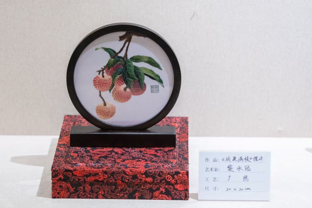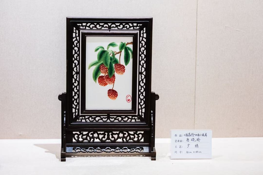 白云区民间文艺家协会会长唐晓玲介绍道,广绣精湛的针法和细腻的工艺,将荔枝壳上纹理、凹凸有致的细腻质感,光影效果表现得栩栩如生,十分灵动。