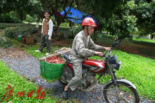 村民将采摘下来的荔枝运到市场卖。