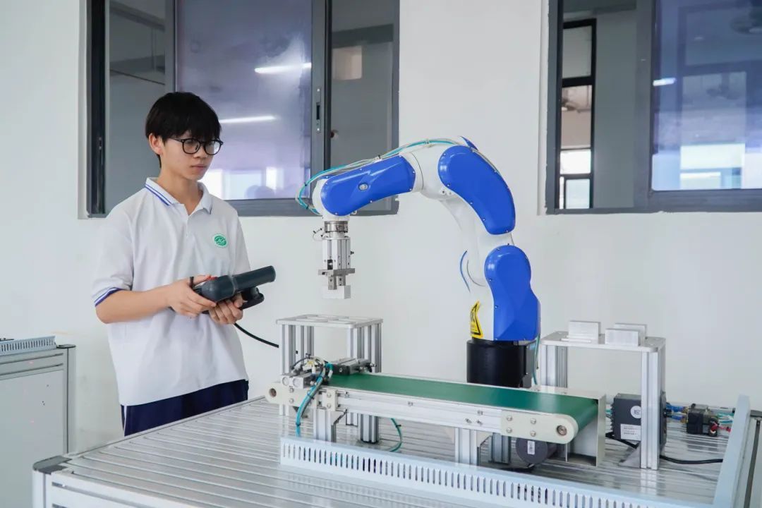 在另一边的工业机器人实训室,工业机器人应用与维护专业的学生们正拿着示教器调试工业机器人。2022级工业机器人应用与维护预备技师班学生梁铠分享说,他同样是被南华工贸先进的实训设备吸引而来,“当初择校时,就是看中了学院的专业实力,能学习到很多专业技能,不断提升自己。同时,学院与很多企业都建立了合作关系,让我对未来的就业很有信心。综合来看,这是一家‘宝藏’学院。”
