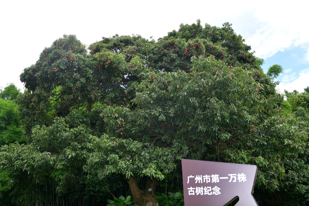 在管养的过程中,为古树腾出足够的成长空间至关重要。在创新公园南门入口不远处,一棵挂着“广州市第一万株古树纪念”牌子的荔枝古树格外醒目。这棵117岁的古树长势喜人,树高8.5米,平均冠幅约13米。去年公园整修时,工作人员细心清理了周围的杂木,为它撑开一片通风透光的天地,并正式挂牌保护。今年古树硕果累累,沉甸甸地压弯了枝头。