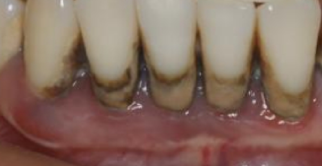 重度牙周色素沉着患者下前牙龈缘呈灰黑色(图片由医院提供)