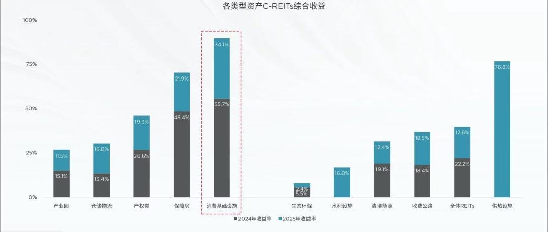 何肇烜表示,相比特许经营权类C-REITs,产权类的C-REITs才具有永续现金流的概念。如果作为长期投资长期配置,可以考虑产权类REITs,目前已经发行的底层资产类别里主要有产业园、仓储物流、保障房和消费基础设施4类。其中,消费类REITs当前表现亮眼,上市以来综合收益近90%,仅2025年就录得综合收益34.1%,是值得关注的类型。