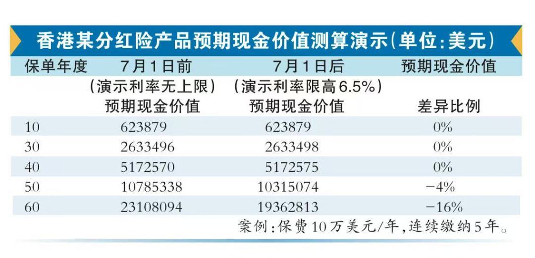 香港保监局发布相关规定,7月1日起,香港分红险演示利率设定上限,港元保单演示利率上限定为6%,非港元保单也限定了6.5%的上限。