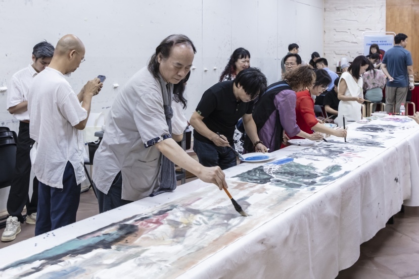 在书画挥毫环节,两岸书画名家合作创作国画长卷,以笔为媒介,以墨为语言,在宣纸上共同勾勒出蕴含两岸融合发展愿景的画作,展现出极高的艺术造诣与默契。两岸书画名家将创作完成后的国画长卷捐赠给广州人民艺术中心,作为此次文化交流的珍贵见证。