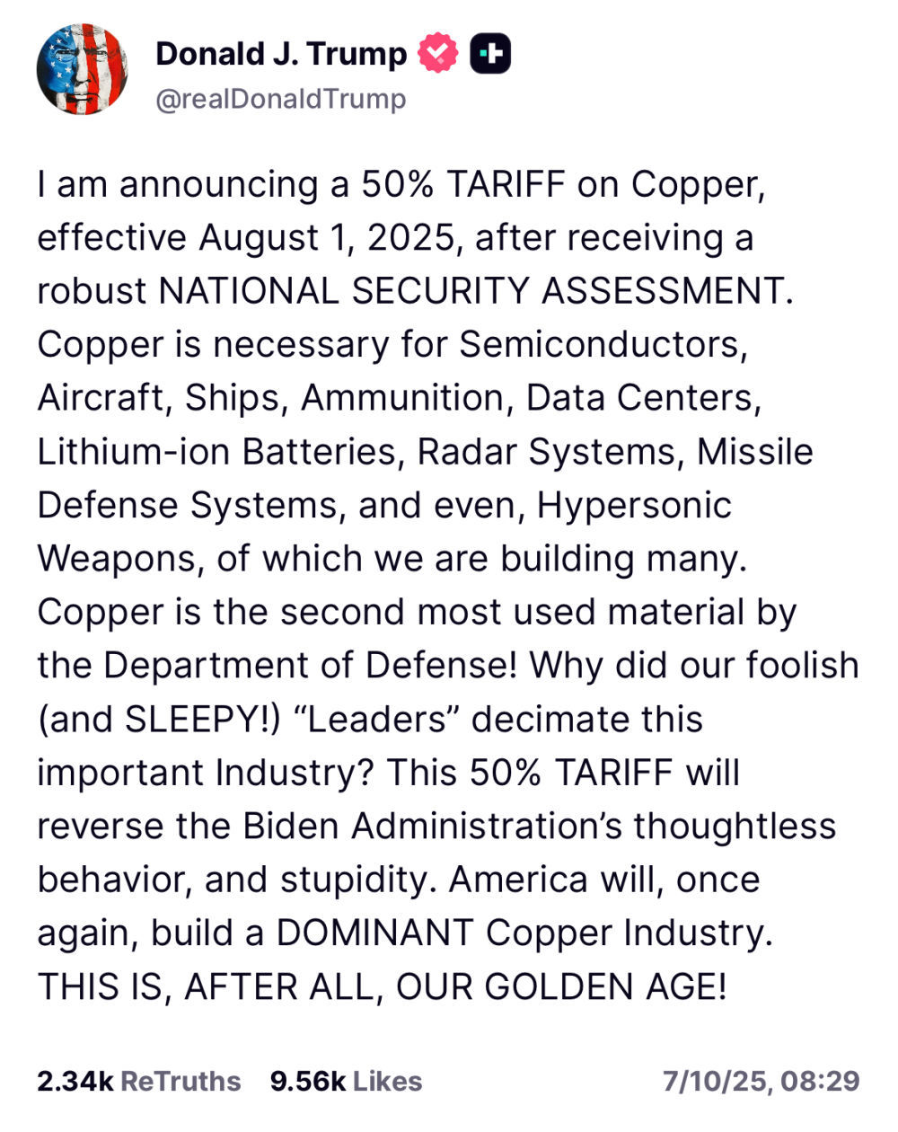 特朗普宣布向进口铜加征关税生效日的社交媒体帖文截图
