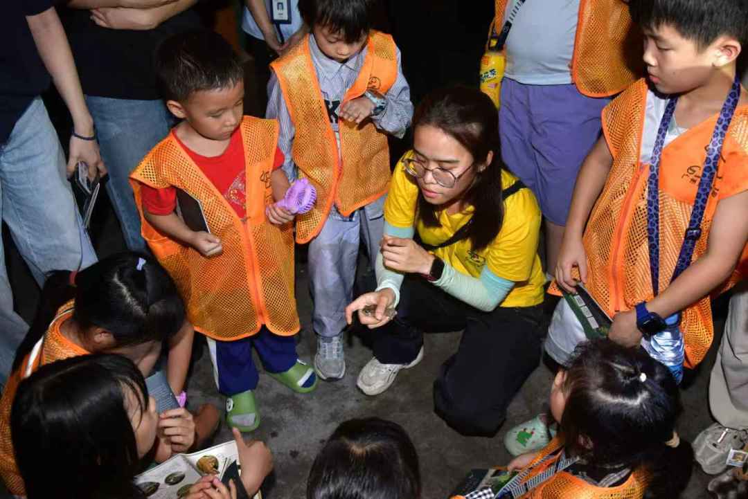 “这种蛙身上有没有小包包?”“大家发现瑶山鳄蜥了吗?”蝉鸣蛙唱的夏夜,在科普导师的带领下,成员们屏息凝神,借助手电筒的微光,在展缸的溪流岩石间仔细搜寻着“爬行界大熊猫”——瑶山鳄蜥的踪迹。活动严格遵守最小影响动物的原则,引导大家观察它们的自然行为,领略多样的生存智慧。成员们沿着精心设计的路线,捕捉到豹变色龙在枝叶间的伪装瞬间、斑腿泛树蛙的活跃身影。白颊长臂猿、北美浣熊、环尾狐猴等动物也展现出与白天截然不同的状态,沿途偶遇的昆虫更添几分神秘色彩。