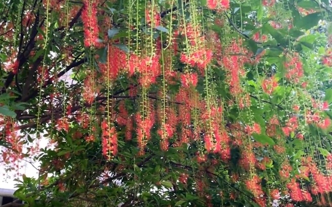 近日记者留意到,傍晚五六点钟,随着羊城暑热渐退,华南国家植物园内的红花玉蕊悄然苏醒。垂落的红色花穗丝丝缕缕,如倒流烟火,似星河垂瀑,在夜色中展开短暂而绚烂的生命仪式。夜间,花苞在月光下簌簌绽裂,暗香浮动;至次日清晨,只余满地落花,无声诉说着昨夜的盛景。