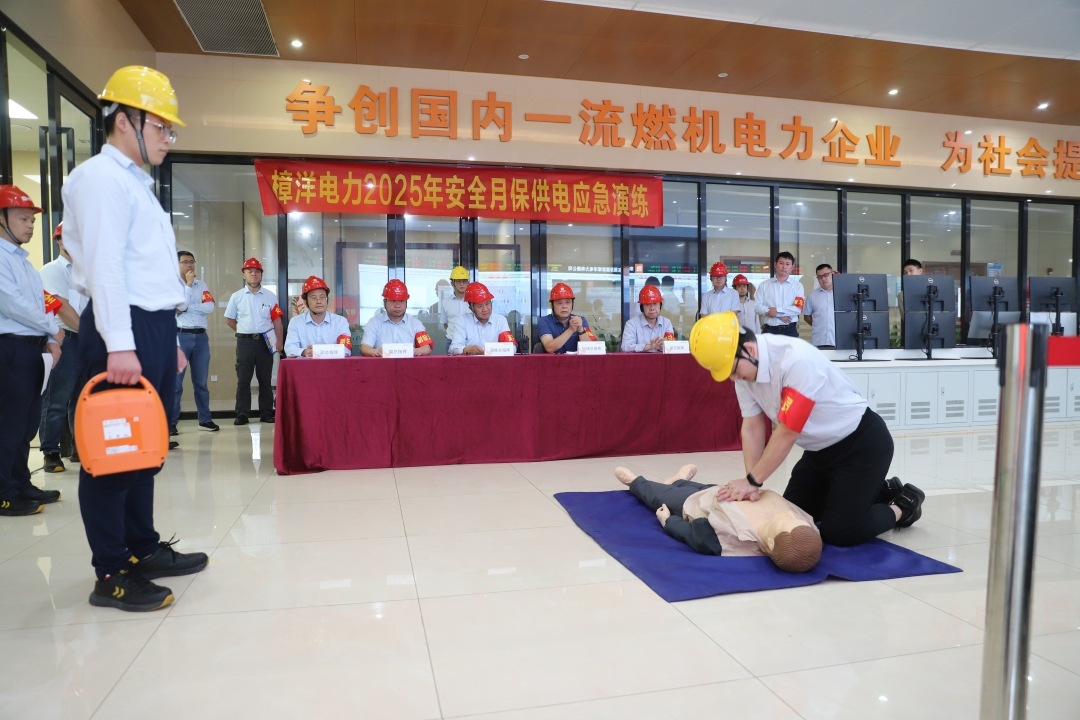 此次演练以台风红色预警为背景,模拟樟莆乙线、樟角甲线同时跳闸导致电厂二期机组厂用电丢失的紧急场景。随着现场总指挥一声令下,深能源樟洋电力应急指挥系统立即启动应急预案,运行人员第一时间切入事故处理流程,逐步有序检查设备状态、隔离故障点,保证机组安全停运,并快速恢复厂用电。过程中,一名值班员在操作柴油机时“触电昏迷”,医疗救援组立即实施心肺复苏并送医,展现了快速响应的救护能力。