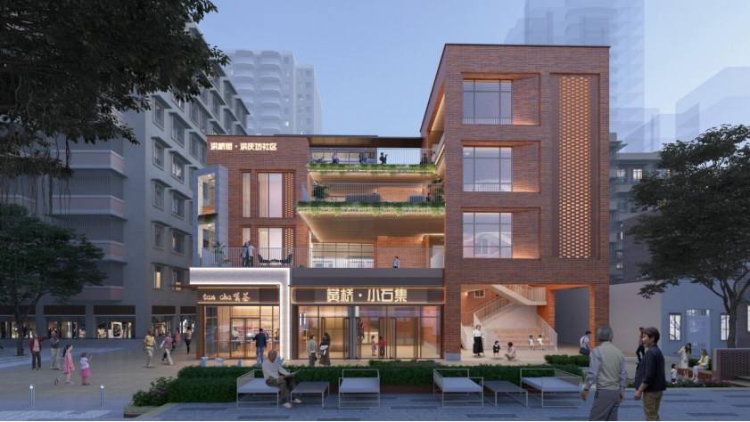 以历史人文为底色,延续传统风貌。项目外立面采用拼色红砖与浅灰质感涂料,复原“红砖灰瓦”岭南底色;屋顶花园、镂空花窗等细节呼应“求学黉桥”历史文脉。
