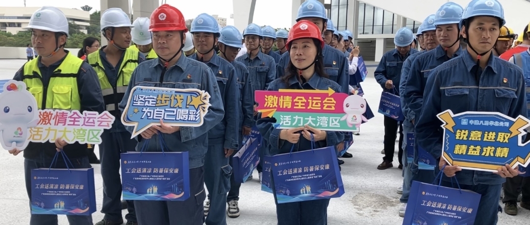 7月11日,广东工会夏季“送清凉”活动走进广东奥林匹克体育中心,为高温下坚守岗位的建设者和赛事保障人员送上“清凉”慰问。