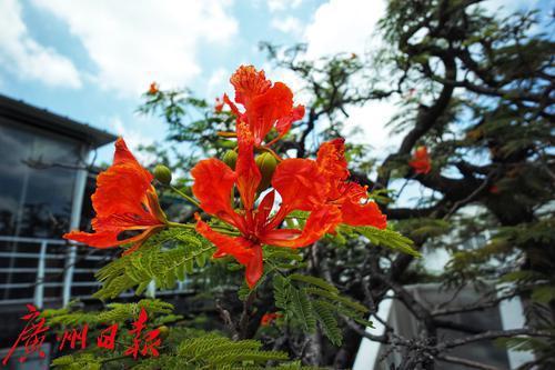 橙红色凤凰花在园区盛开。