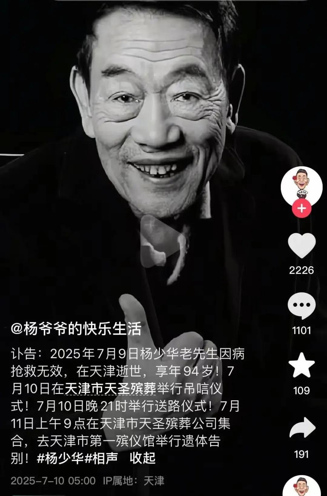 2025年7月9日,杨少华老先生因病抢救无效,在天津逝世,享年94岁!7月10日在天津市天圣殡葬举行吊唁仪式!7月10日晚21时举行送路仪式!7月11日上午9点在天津市天圣殡葬公司集合,去天津市第一殡仪馆举行遗体告别!