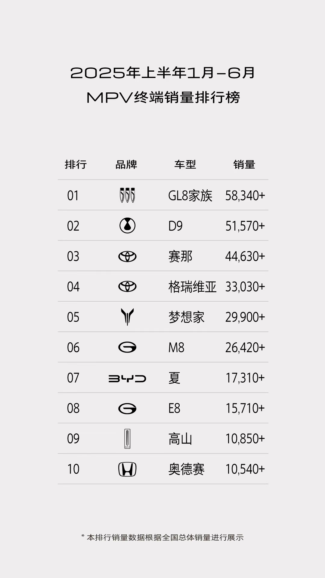 7月11日,记者从上汽通用别克方面获悉,别克GL8家族1-6月终端销量达58340+辆,并连续三个月销量破万,在2025上半年MPV市场销量排行榜(下称“榜单”)中排名第一。