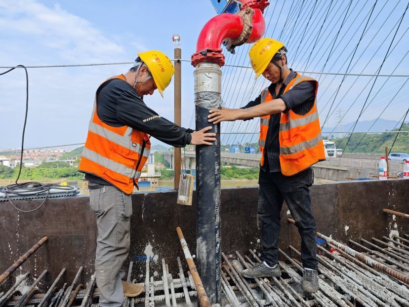 作为全桥关键受力构件,下横梁施工面临结构复杂、钢筋密集、浇筑方量大等技术挑战。项目团队科学筹划,严格把控模板安装、混凝土配比及振捣质量。为克服施工过程中混凝土运输不便、钢筋及钢梁与预应力管道碰撞、混凝土入模温度高等困难。项目管理处、总监办、施工单位多次开会研究施工方案,通过采取租赁一艘拌和船供应混凝土,使用地泵+布料机进行浇筑;通过BIM建模检查碰撞,提前规划钢筋加工和安装位置;通过购置冰块对拌合用水进行降温等,有效解决了浇筑过程中存在的困难。
