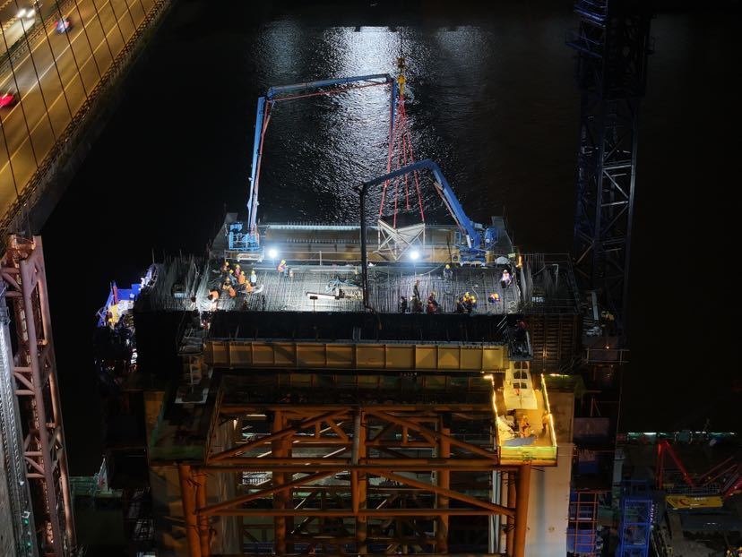 此次下横梁浇筑历经近24个小时,为新建金马大桥主塔实现年底封顶创造了有利条件。