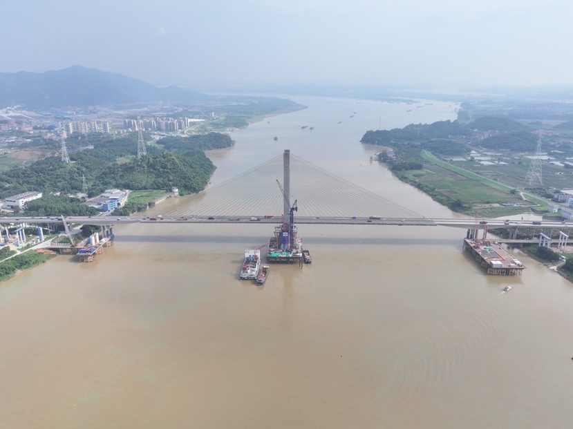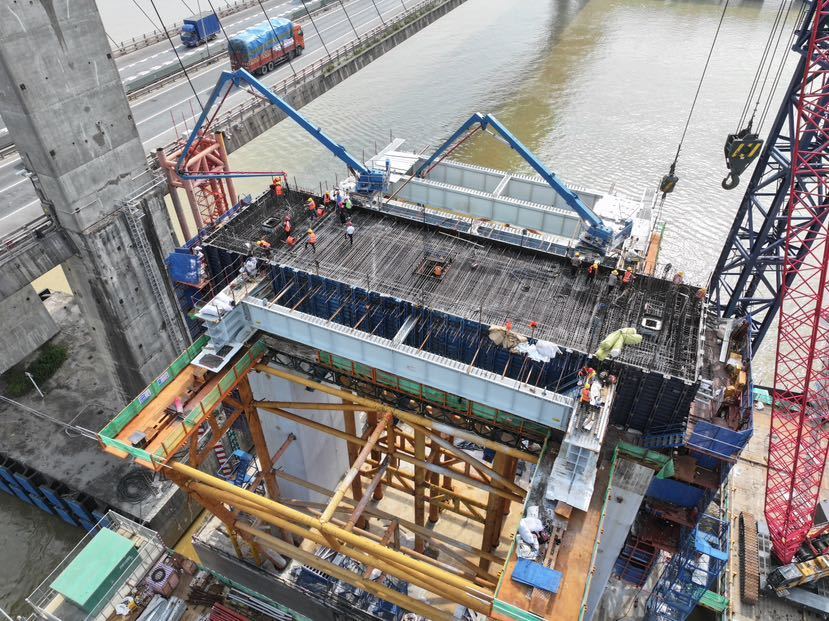 7月9日22时,广东交通集团所属广肇高速改扩建项目新建金马大桥工程建设取得重要进展——主桥主墩下横梁及第5节塔柱混凝土浇筑作业圆满完成。这一里程碑事件标志着新建金马大桥主体结构施工迈入新阶段,为后续上部结构及桥面施工筑牢基础。