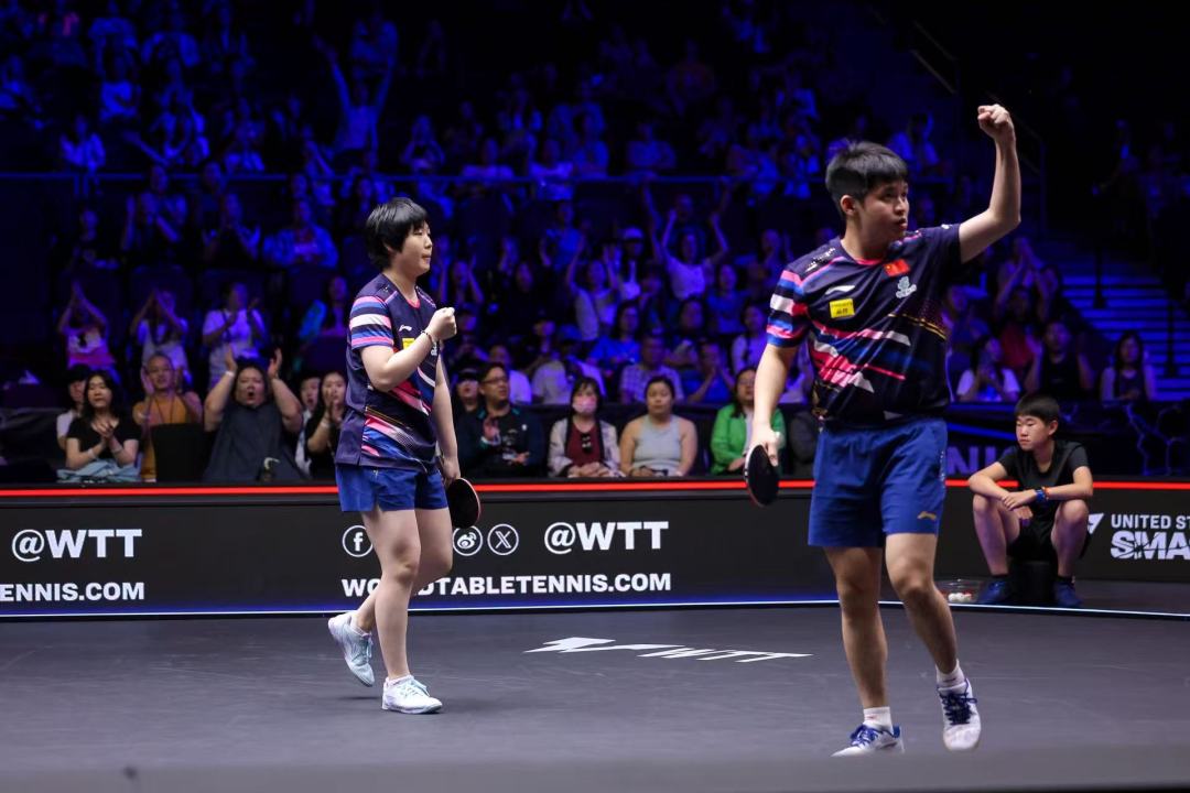 WTT美国大满贯于北京时间今天下午在拉斯维加斯决出混双冠军。中国队的林诗栋/蒯曼直落三局击败韩国队组合林钟勋/申裕斌,勇夺冠军。在女双项目,两对组合孙颖莎/王曼昱、王艺迪/蒯曼会师决赛,提前为国乒锁定这个项目的冠军。在男双项目,国乒唯一挺进四强的组合王楚钦/梁靖崑无缘决赛,提前退出争冠行列。