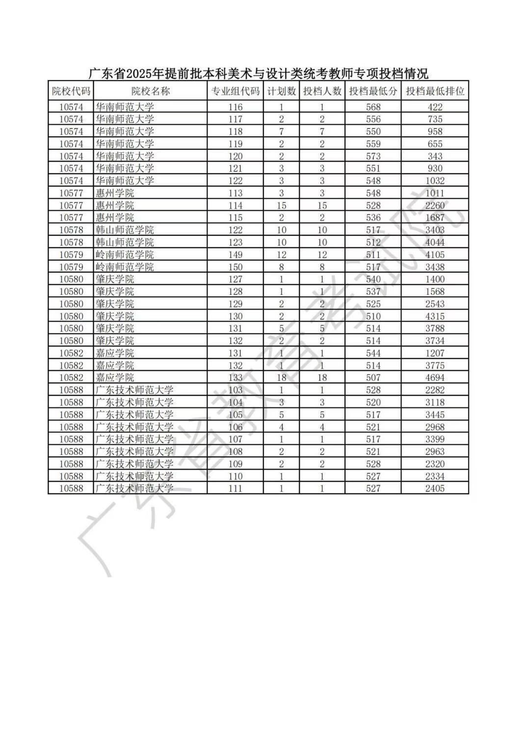 在美术与设计类统考教师专项,华南师范大学120专业组投档最低分573分,投档最低排位343,位居第一。该专业组招生计划2人,毕业生将定向至惠州市博罗县就业。