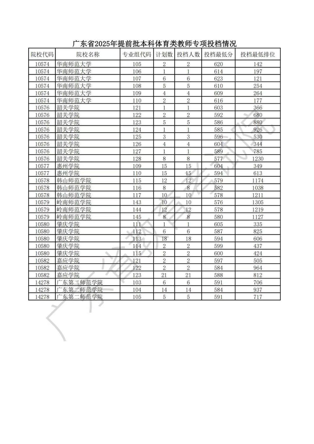 在体育类教师专项,华南师范大学107专业组投档最低分623分,投档最低排位121,位居第一。该专业组招生计划6人,毕业生将定向至惠州市博罗县就业。