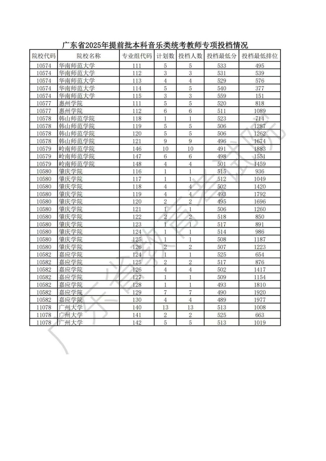 在音乐类统考教师专项,华南师范大学115专业组投档最低分559分,投档最低排位151,位居第一。该专业组招生计划3人,毕业生将定向至惠州市博罗县就业。韩山师范学院、岭南师范学院、肇庆学院、嘉应学院等有专业组在500分以下完成投档,考生可谓“幸运儿”。相关专业组都是定向培养,考生毕业后将被派遣到定向服务单位任教不少于6年。