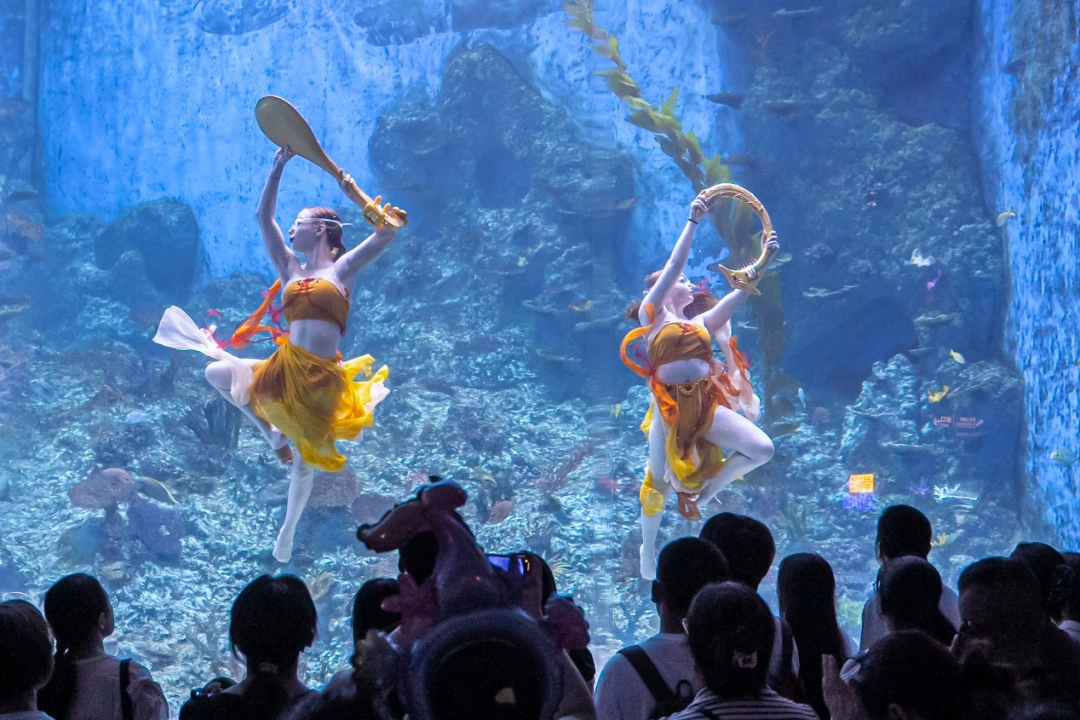 灵感取材于敦煌壁画的人鱼表演《水舞敦煌》于7月12日全新上线,巧妙融合了敦煌飞天文化与现代舞蹈艺术,为游客带来前所未有的文化体验。7月12日起,逢周六日新增美人鱼合影环节,美人鱼化身白雪公主、花仙子、哪吒、小龙女等经典角色与游客互动,定格梦幻瞬间。