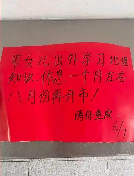 “带女儿出外学习地理知识,休息一个月左右,八月份再开始!”近日,在网络上一份署名“涛仔鱼皮”的通知引发网友热议。