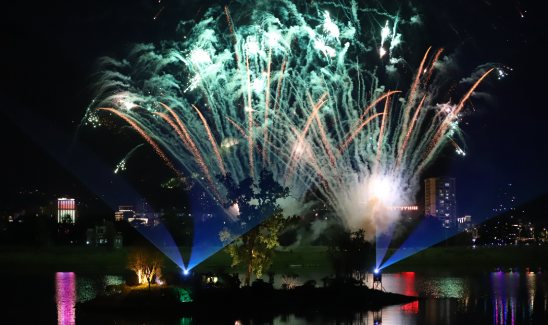 压轴登场的首场烟花汇演将气氛推向顶峰。一场精心编排的无人机与烟花融合表演点亮海阳湖中央公园夜空。无人机编队灵动变幻,勾勒出“诗豪善郡 福寿连州”“连州欢迎您”等字样及连州著名景点轮廓,与璀璨烟花交相辉映。长达半小时的沉浸式视觉奇观,引发观众阵阵惊叹与欢呼,为启幕之夜画上完美句点。
